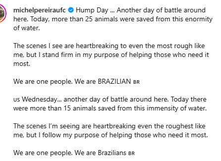 But with his home nation going through a tragedy Pereira isn’t in the gym preparing for his next fight. Pereira has been in a boat and climbing roofs helping to save animals.