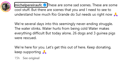 In a single day, the group Pereira is working managed to save 26 dogs and 3 guinea pigs. Another day it appears the team saved between 15-25 more animals. Pereira has also announced he’s going to be auctioning off his UFC custom 301 jacket and fight worn gloves.