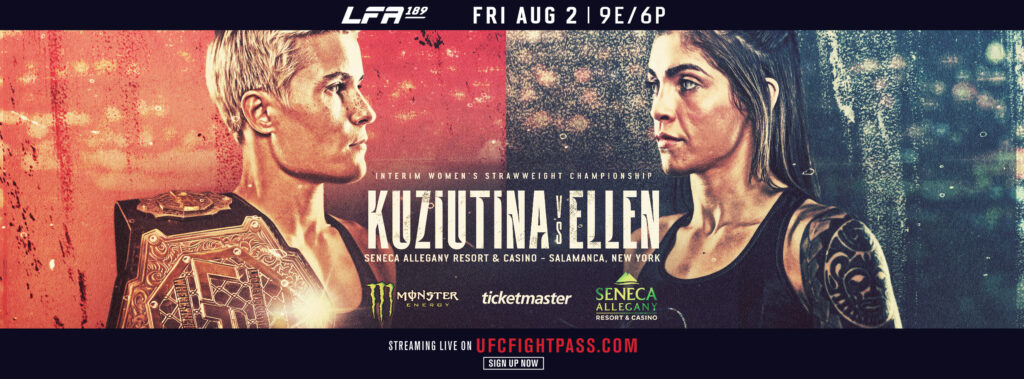 The Seneca Allegany Resort & Casino in Salamanca, NY hosts LFA 189 where the LFA Women’s interim Strawweight title is on the line. In the main event Russian Judoka Natasha Kuzitutina defends against Brazilian Sanda expert Bruna Ellen.