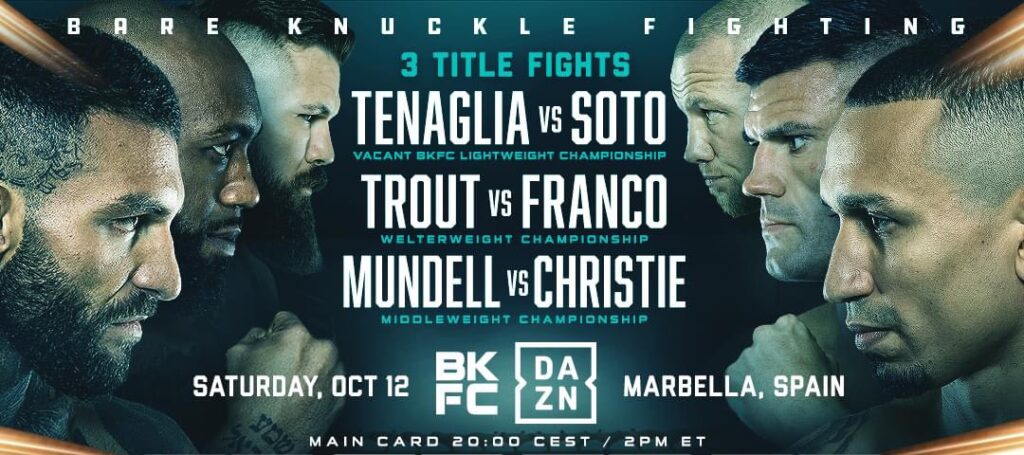Bare Knuckle Fighting Championships is at the Marbella Arena for BKFC Spain. A championship triple header has the Vacant Lightweight title along with the BKFC Welterweight & Middleweight world titles on the line.