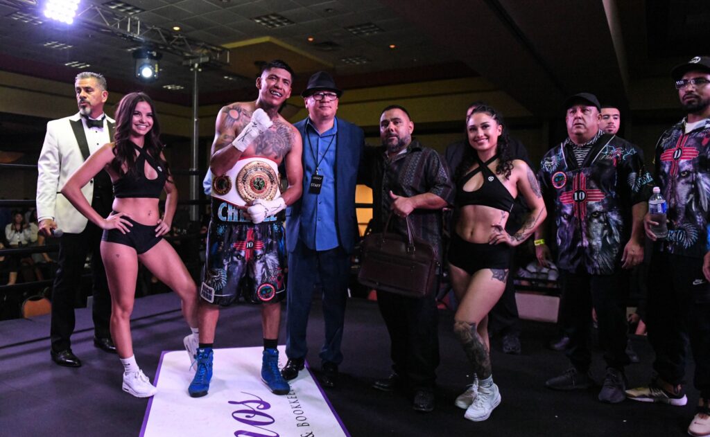 In the main event, the UBO Super Welterweight Championship was on the line. Clinton “Native Kid” Chavez of Albuquerque, NM came in at 7-2 (4 KO) and his opponent Mario Gonzalez of Hobbs NM came in with an equally impressive record of 5-0 (4KO). Gonzalez came out of his corner hot and bolstered by a large hometown crowd who came up to support him. The Hobbs fighter went to work early on Chavez with an aggressive posture and flurries of punches. Chavez, who also had a large and vocal crowd supporting him, stayed poised and eventually launched his own barrages countering Gonzalez’s initial early round lead. “I knew he was tough opponent–I’ve seen him fight before ” said Chavez after the bout. “I kind of knew it would go 8 rounds–my corner said I had to take these last 2 rounds—I had to take him out and I did,” said Chavez. “I seen him hurt–I took advantage of that–I saw him breathing hard and I just took advantage—I got it done,” said Chavez in conclusion. Chavez won his first professional championship by TKO in the 8th and final round as the referee stopped the match at 2:55.