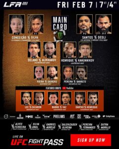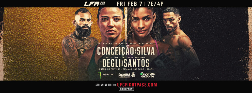 For the first time in 2025 LFA has traveled to South America for LFA 201. The Ginasio do Povilho in Cajamar, Sao Paulo, Brazil will host the championship double header. In the main event Rose Conceicao defends the LFA Women’s Strawweight championship for the first time against Lany Silva. Conceicao is returning to the LFA after an opportunity on the Contenders Series. An interim LFA Flyweight title is on the line in the main event as Marcos Degli squares off with Lincon Santos. The main card streamed globally on UFC Fight Pass.