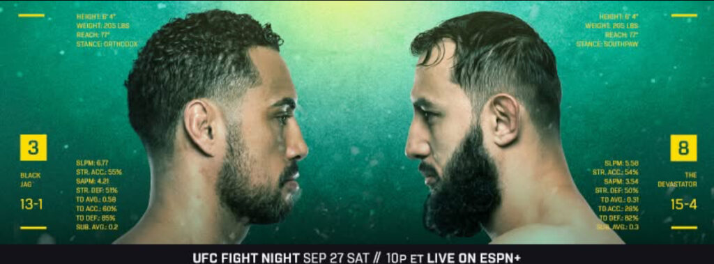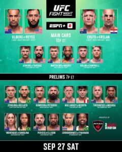 Number-three ranked contender Carlos “Black Jag” Ulberg faces off against number-eight ranked Dominick “The Devastator” Reyes in the main event. New Zealand’s Ulberg has rebounded from a rocky UFC debut with an impressive eight-fight win streak. The City Kickboxing standout has steadily built a resume worthy of title contention, including recent victories over former title challenger Volkan Oezdemir and ex-champion Jan Błachowicz.