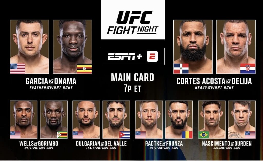 The headliner features No. 12 Steve Garcia taking on No. 13 David Onama in a battle between streaking contenders who’ve combined for ten straight wins. Garcia owns six of those victories, including five consecutive knockouts before going the distance with Calvin Kattar. Onama rides a four-fight win streak of his own, most recently earning an impressive victory over veteran kickboxer Giga Chikadze.