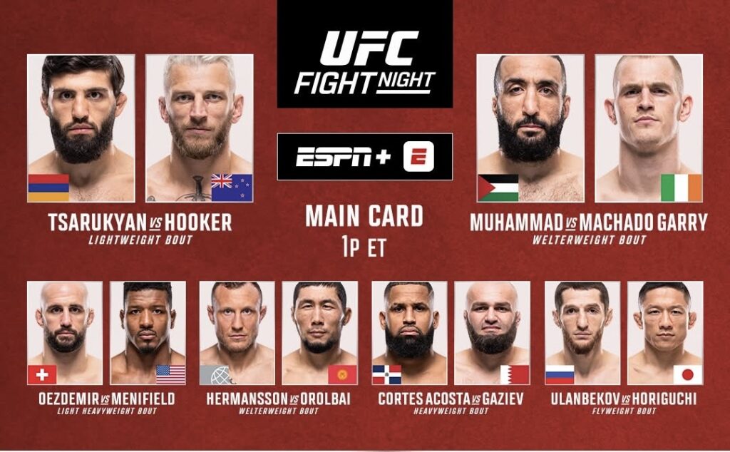 In the headliner, No. 1–ranked lightweight contender Arman Tsarukyan takes on No. 6–ranked Dan Hooker. Tsarukyan competes for the first time this year after withdrawing from a scheduled January title fight just before weigh-ins due to a back injury. The Armenian standout enters on a four-fight winning streak. Hooker returns after a 15-month layoff; “The Hangman” was last seen earning his third consecutive victory, a split decision over Mateusz Gamrot.
