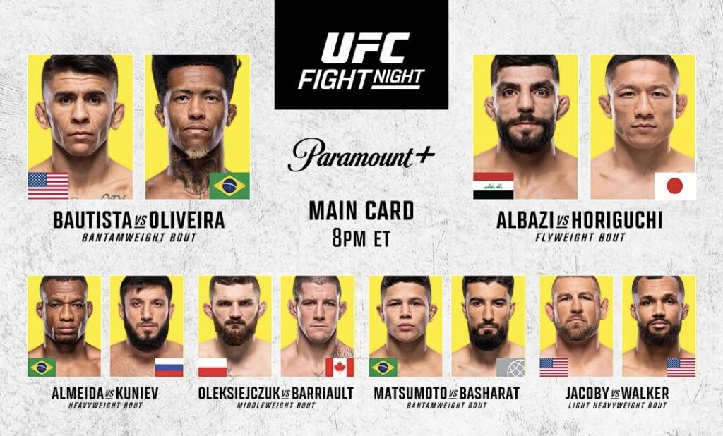 In the main event, ninth-ranked Mario Bautista squares off with the number 11 contender Vinicius “Lok Dog” Oliveira. Arizona’s Bautista has quietly put together an impressive 10–3 run in the UFC, punctuated by statement wins that spoiled both Jose Aldo’s retirement bout and Patchy Mix’s promotional debut.